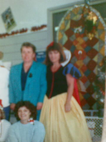 Thought you might like a laugh.  I tried to find a couple of pictures of me with dark hair,  I played the part of “snow white” for a day at work one Christmas week back in the 1980’s. (the glass stain window in the background was one of my creative whims).  It’s only been the last 5 years that I have gone blonde.  (sorry for the very poor quality taken by cellphone)  I only found this one.   Enjoy.