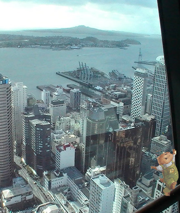 At the Sky Tower,  the view is amazing, looking straight out at Rangitoto Island, a volcano you can walk over, sitting in the middle of their harbour…. How cool is that!   Did you know that Auckland city alone is built on thirteen volcanoes… Diane said we should whisper so as not to awaken them…. I think she was kidding…. I HOPE she was kidding!    They even have one viewing platform floor made only of glass….. that was real creepy at first,  seeing all those cars down there looking like ants…. I laughed at Tamie trying to peck the glass… he must have been hungry!  We had a wonderful meal up here, all you can eat  I heard that you can bungy jump off the sky tower and also walk around the outside,  we didn’t!  But we watched others doing it… Way Cool!  Diane was just scared I would slip and fall.  Then how would she explain to Susanne what happened to me….Gulp!