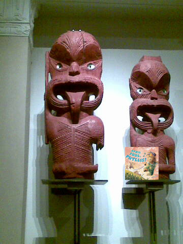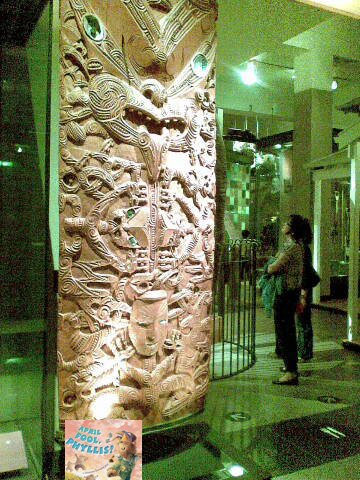Met some really unusual friends inside like this one.  TekoTeko designs like these represent ancestors, and with protruding tongue is representing a war dance, like the Haka.  Diane tried to show me a Haka…. Just so funny and definitely not fit to be shown…*giggles*.     The huge  carvings like these again representing ancestors and line of power, are often carved on beams of meeting houses with paua eyes, to ward of evil spirits.  After being caught climbing into a waka, totally forbidden in the museum, seeing lots of Maori artware  and meeting lots of other huge beasts.