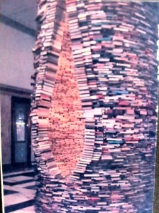 This is made of books situated in the foyer of the university. By pearing into the center a mirror situated on the floor gives the impression you are tetering on the edge and peering way down the tower below of books….. scary!