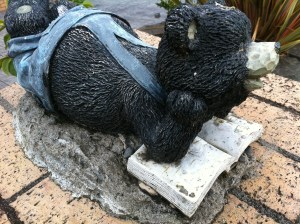 After completing my April draft I immediately got down to thinking about my May draft. Something I had been wanting to tackle since I had returned from an overseas trip in August last year. A story of travel an idea that had come to me via a woman I met on a plane. She was a Headmistress of an Australian School and was totally interested in my writing ventures in children’s books. When I have allowed myself to think of how to approach the story I had always visioned a child, in fact in all my stories my main character was human. I don’t know why, but I had never thought of anything else. When I tackled this particular draft with my protagonist, a little boy, I kept finding I couldn’t get into it, like something was not quite right, I felt very detached. It wasn’t till I was taking a walk outside the front of our house one day a couple of weekends ago, when it suddenly struck me, right there, on top of my letterbox. How could I have not realised it before! I stood looking at it, took photos of it, and in my mind I suddenly saw my story take on a new life. I raced inside and immediately took down some notes. My protagonist would be this little black bear in blue overalls. I had aquired him a couple of years ago and I decided he would look great on my letterbox. He has had a rough time, weathered, and there has even been attemps to pinch him, hence he is now concreted on. His body language, his thoughts and his actions were perfect, just perfect.