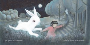 Why I like this:  This is a beautiful whimsical dream-like read, ideal for bedtime reading.  Little Luna is told by her Grandmother of the large white rabbit in the moon and that if she leaves a rice cake out he may visit her.  I loved how when she fell asleep the rabbit appeared and took Luna on a magical adventure in the nearby woods.  The soothing illustrations are all set in wispy greys of night-time. The pink rabbit onesie complete with rabbit ears and pompom tail she wears is very cute. The rabbit never speaks but understood and cares for Luna.